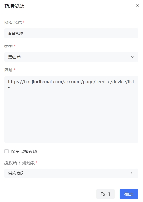 2. 第二步:创建黑白名单规则。选择白名单/黑名单模式,输入URL(支持*号通配符),根据需求勾选“保留完整参数”。